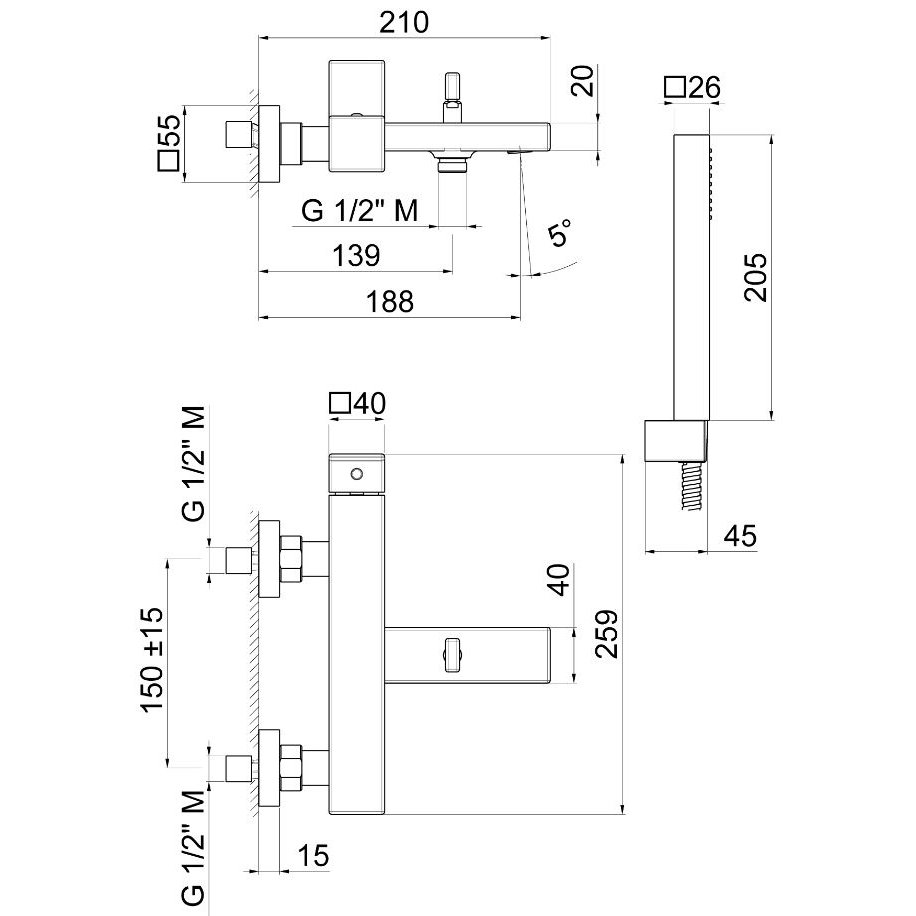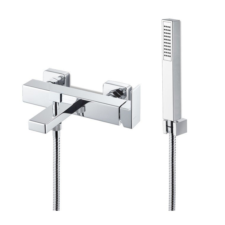 Externe Wannengruppe komplett mit festem Support, flexiblem Schlauch und Handbrause.