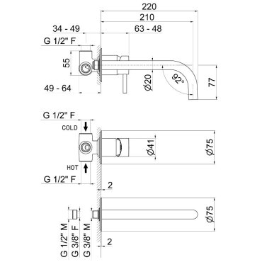 Waschtisch- Wandmischer, komplett mit Unterputzteilen, ohne Ablauf, Auslauf LL. 220 mm und Anschlussteile.