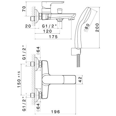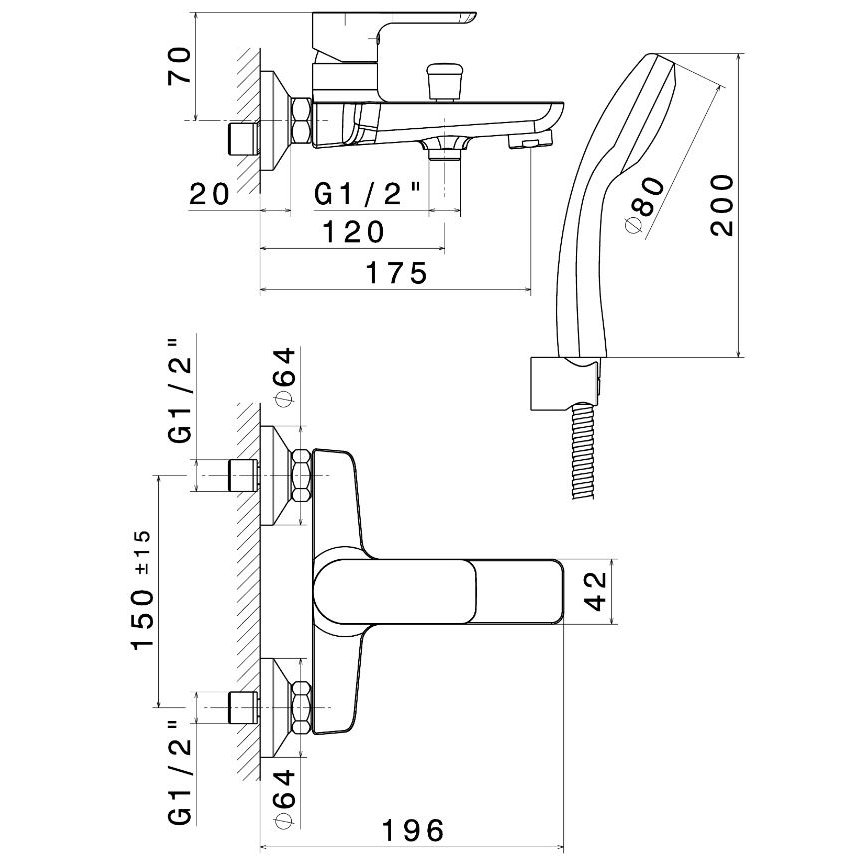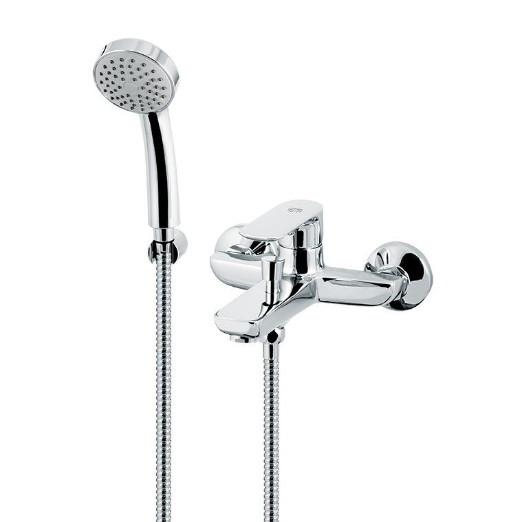 Externe Wannengruppe komplett mit festem Träger, flexiblem Schlauch und Handbrause.