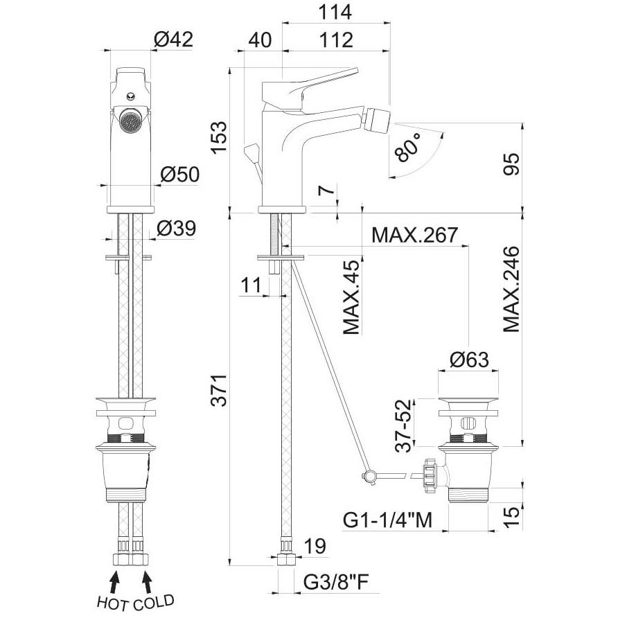 Einhebel-Bidetmischer mit 1"1/4-Ablaufgarnitur.