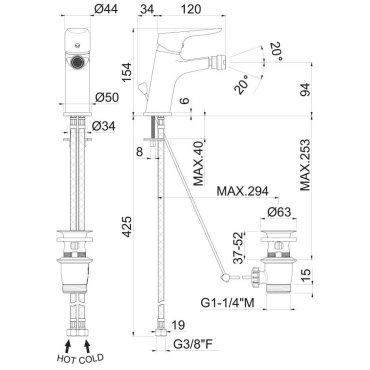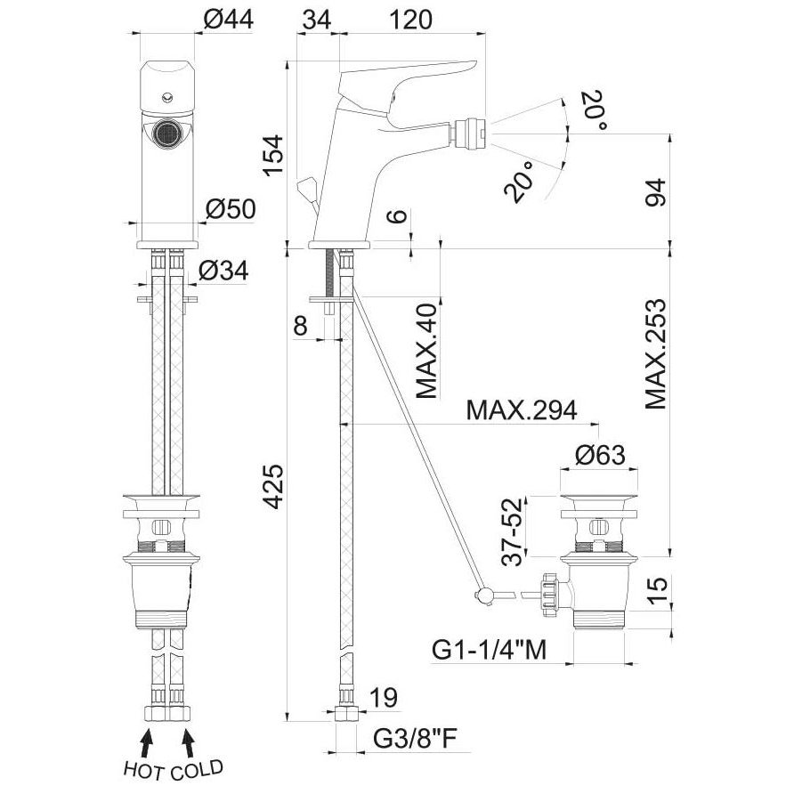 Einhebel-Bidetmischer mit 1"1/4-Ablaufgarnitur.