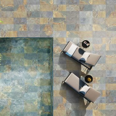 Erhältlich in vier Farbnuancen (Slate, Quarzite, Piasentina and Barge), verbindet Rock die Ästhetik des Materials mit Witterungsbeständigkeit und Rutschfestigkeit dank der Oberfläche Grip R11.
