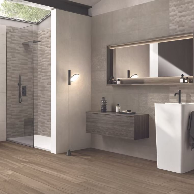 Die Fliesen sind im Format 20x60 cm mit einer Stärke von 7,7 mm und einer nicht rektifizierten Kante erhältlich. Creta ist in den neutralen Farben Grigio, Neutro und Tortora verfügbar und wird durch die Dekore Foglie und Muretto ergänzt.
