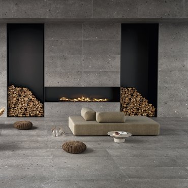 Die Wirkung des auf das Porzellansteinzeug reproduzierten Steins ist vielfältig gestaltet und verleiht den Oberflächen Dynamik.