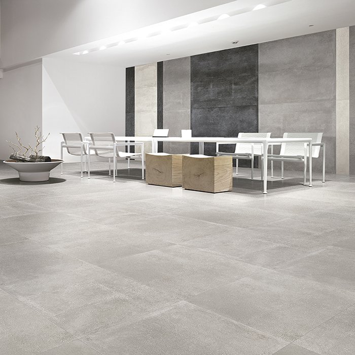 Die Kollektion Nr. 21 aus Steinzeug mit Betoneffekt von Viva ebnet und deckt Außen- und Innenräume im urbanen Stil ab.