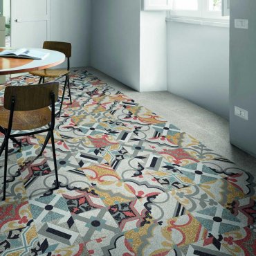 The fascination for vintage cement tiles and Venetian Seminato, in particular, live again on the surface of this 20x20 porcelain stoneware collection thanks to small glossy and matt marble chips in contrast.