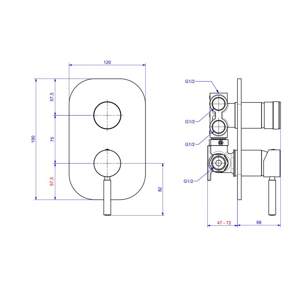 mixer single lever shower built-in diverter body plate termostatic regolation temperature thermostat degrees water connections ways exit exits 2232