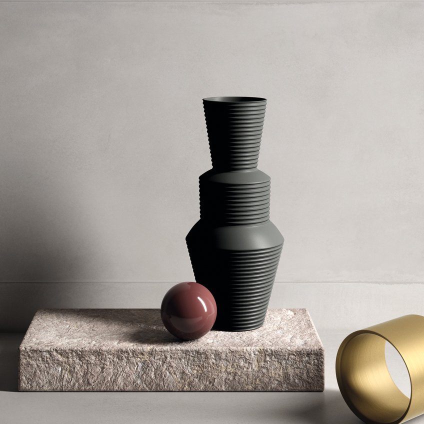 The collection proposes with originality the processing of terracotta. The marks on the surface recall the beaten earth as well as the shiny parts denote the passing of time.
