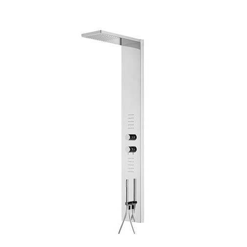 Stainless steel outdoor shower column with three outlets with antilime rain shower head, 2 frontal antilime jets and hand shower with mechanical mixer.