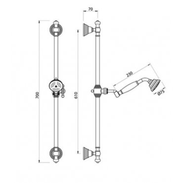 Antique heavy brass sliding rail composed of: ramp with rod made entirely of brass, retro single-jet brass hand shower, flexible cm.150, without soap dish.