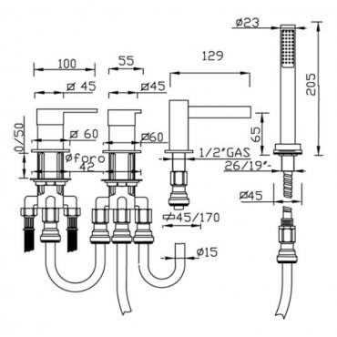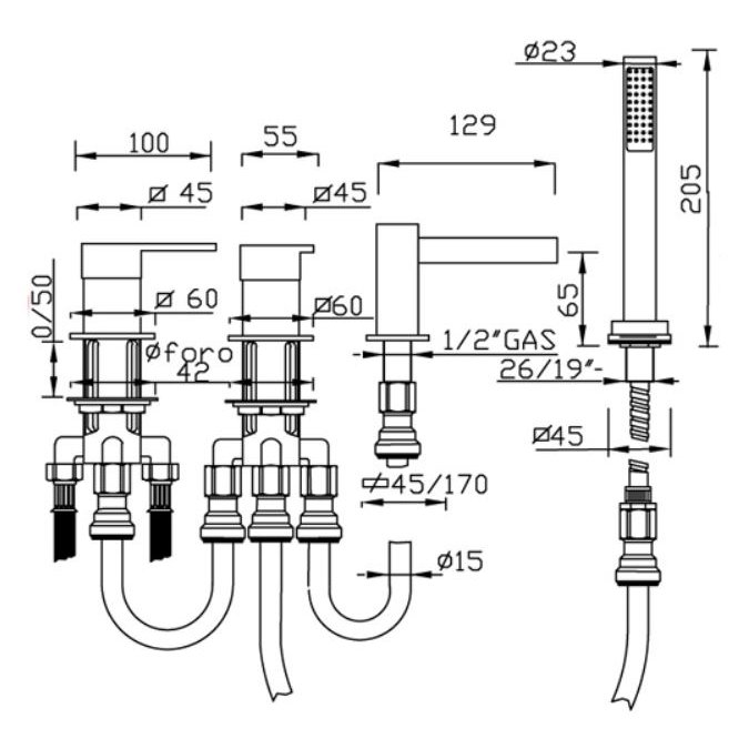 GABOLI FRATELLI NEW SPACE DECK-MOUNTED BATH MIXER WITH SPOUT AND SHOWER SET