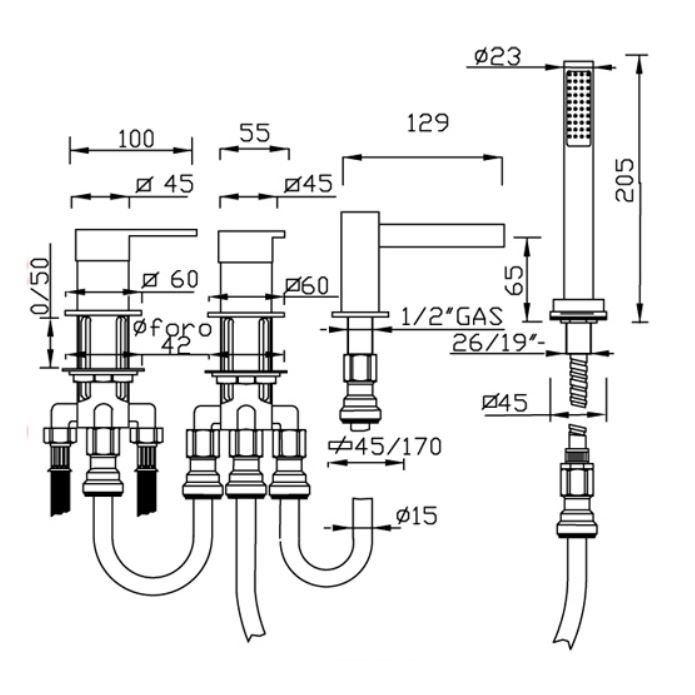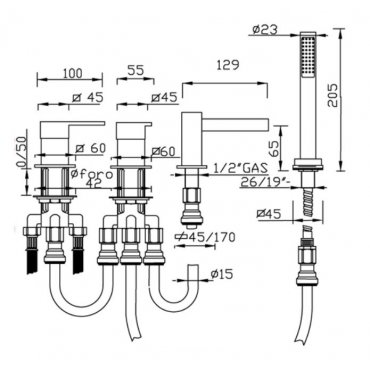 GABOLI FRATELLI OPEN SPACE DECK-MOUNTED BATH MIXER WITH WATERFALL SPOUT, SHOWER