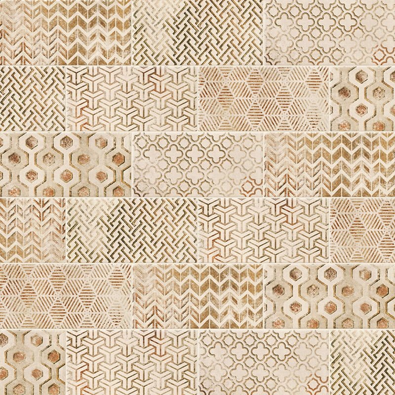 Mainzu's Ravena wall tile collection highlights warm-looking colours such as blanco, natural and crema, enriched by vintage and timeless patterns, with touches of purple, pink and green, which blend well together.