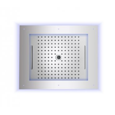 The different variants include waterfall, rain shower with horizontal or vertical wall arm, side and ceiling mounted shower heads with RGB LED chromotherapy.
