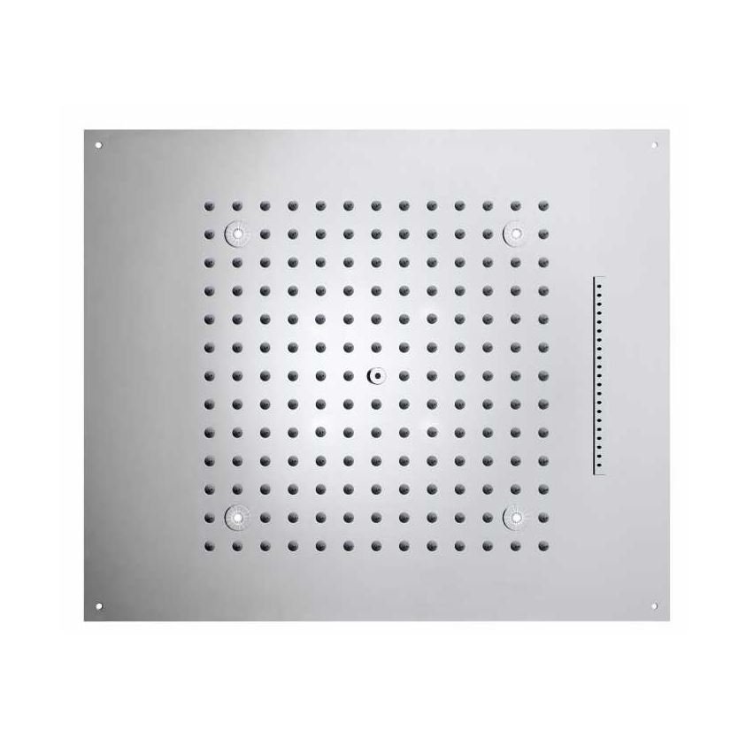 The different variants include waterfall, rain shower with horizontal or vertical wall arm, side and ceiling mounted shower heads with RGB LED chromotherapy.