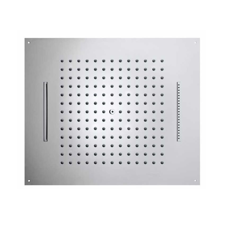The different variants include waterfall, rain shower with horizontal or vertical wall arm, side and ceiling mounted shower heads with RGB LED chromotherapy.