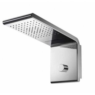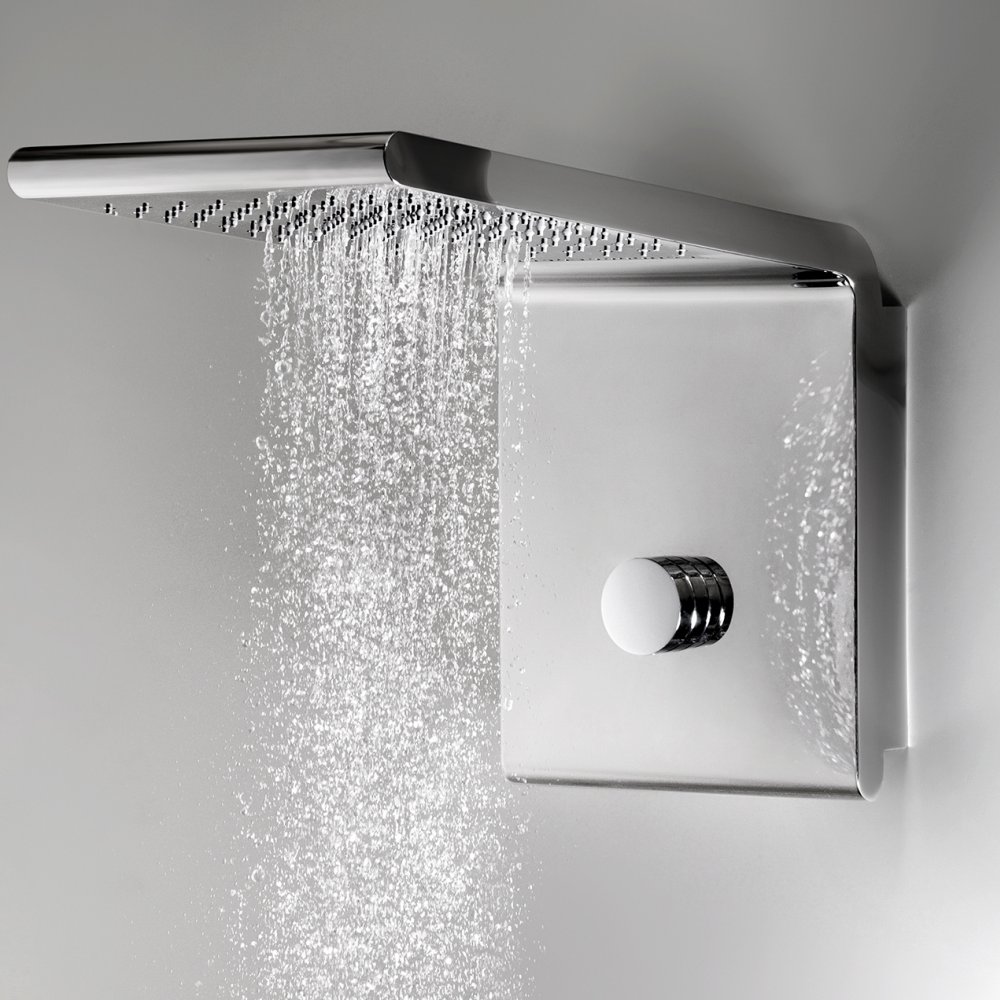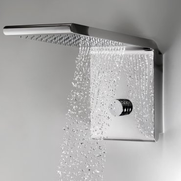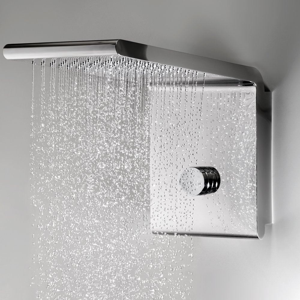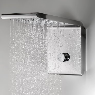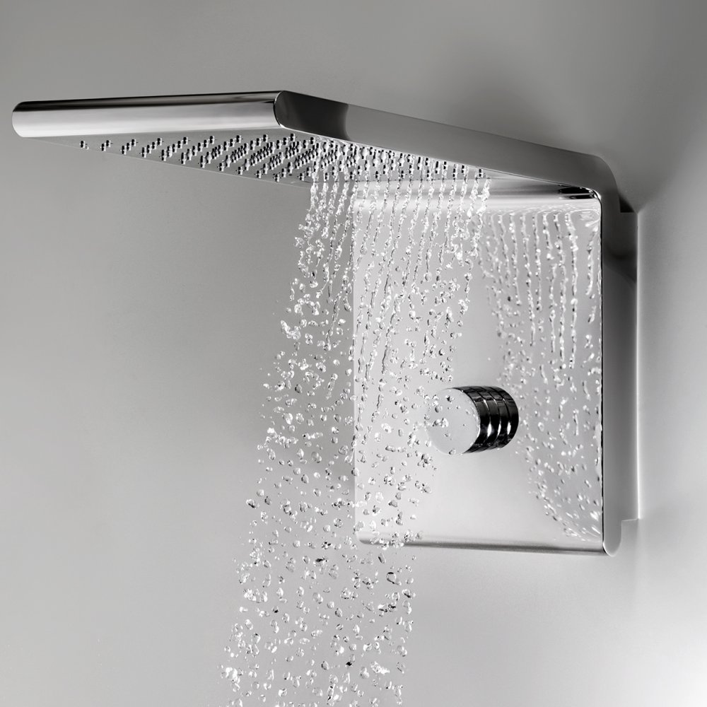 The different variants include waterfall, rain shower with horizontal or vertical wall arm, side and ceiling mounted shower heads with RGB LED chromotherapy.