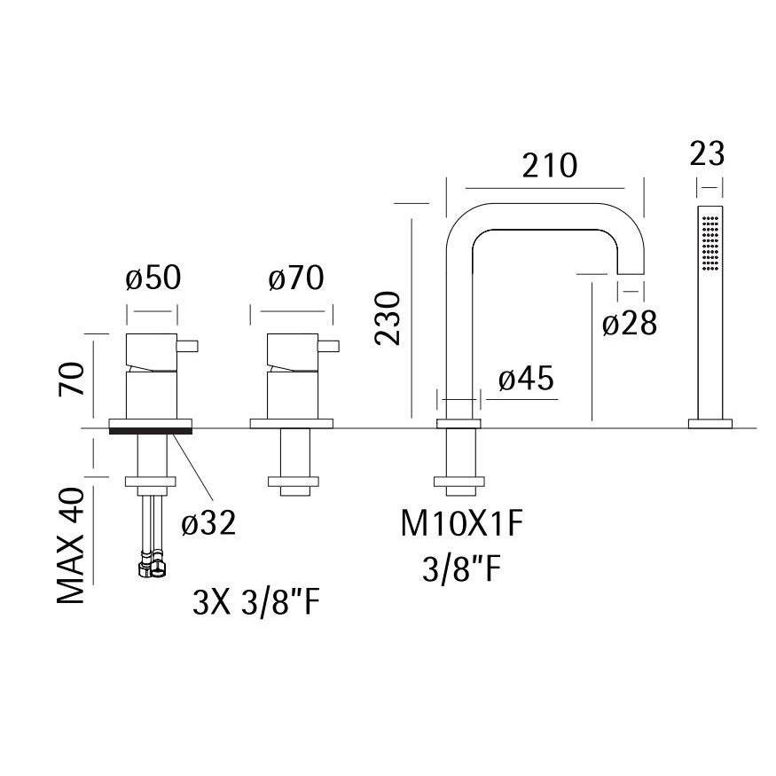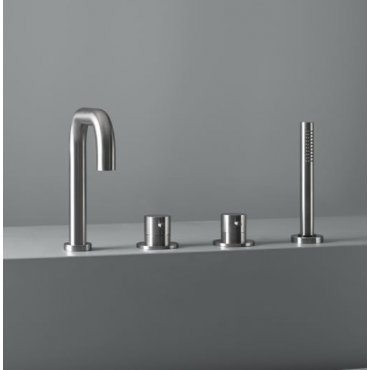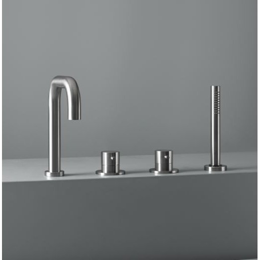 Group of 2 mixers on the bath rim with spout and hand shower.