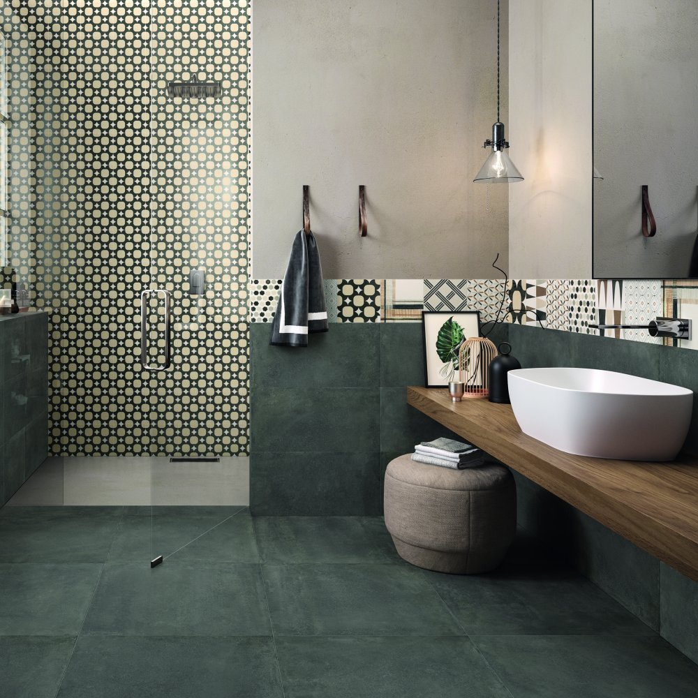 La serie è impreziosita da un mix di 9 differenti cementine decorate 20x20 e da lastre 120x120 e 120x240.