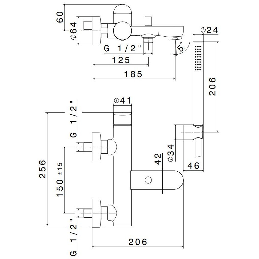 NEWFORM LINFA II BATH MIXER WITH FIXED SUPPORT, FLEXIBLE HOSE AND HAND SHOWER