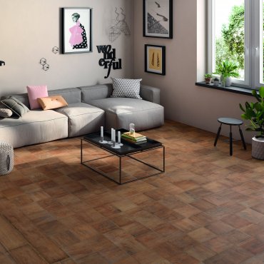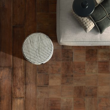 A well combined wood effect porcelain stoneware project in which the usual long strip tiles and the unfamiliar 20x20 size perfectly coexist.