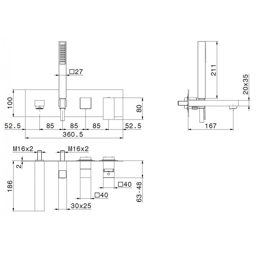 • IB RUBINETTERIE BELMONDO WALL MOUNTED BATH FILLER COMPLETE WITH HAND SHOWER KIT