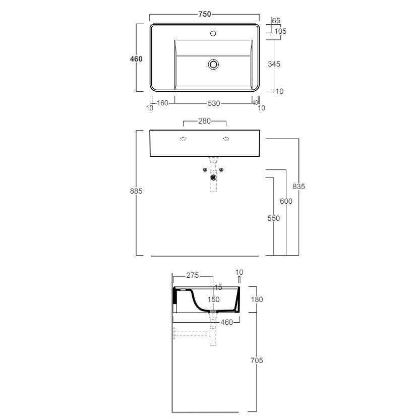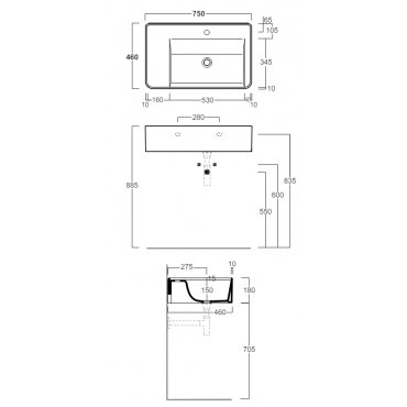 SIMAS RATIO SINGLE HOLE BASIN COUNTER TOP OR HUNG WHITE 75X46CM