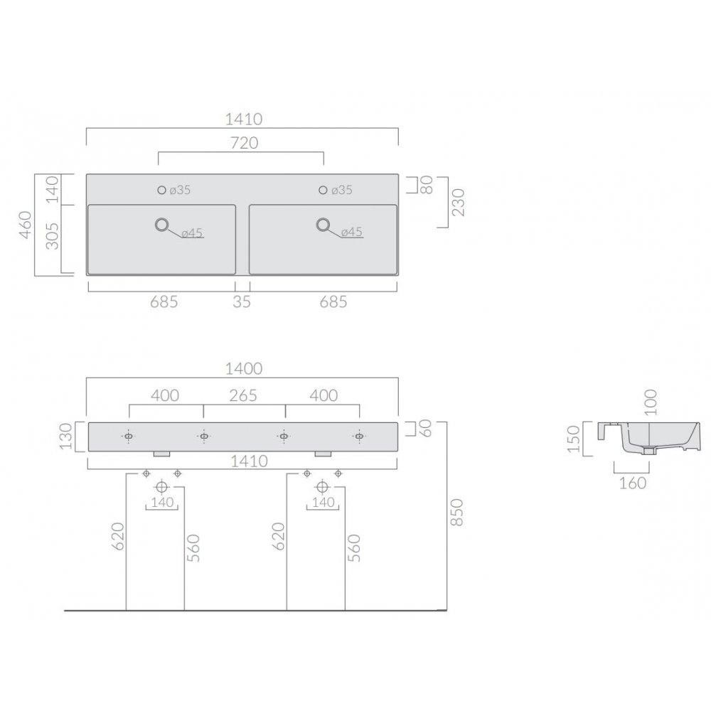 GALASSIA MEG11 PRO DOUBLE WASHBASIN COUNTERTOP OR WALL-HUNG WHITE 141X46