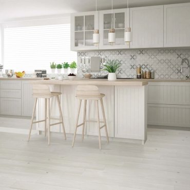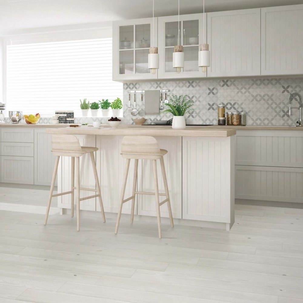 The wood-effect porcelain stoneware features delicate, light veining and almost imperceptible knots, giving it a refined, natural look.