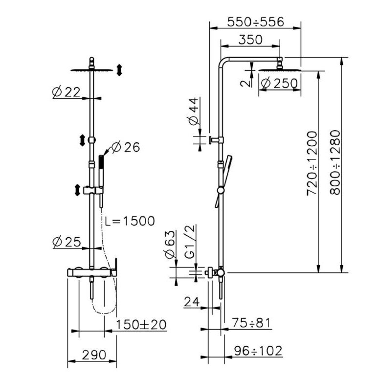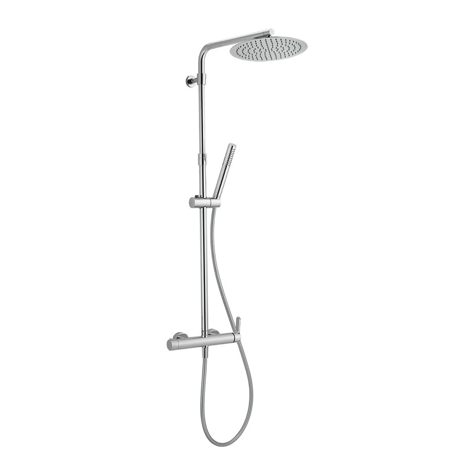2-function single-lever shower column, 2 outlet diverter, telescopic column, sliding hand shower support, minimalist single-jet hand shower in ABS D.26 mm, round shower head D.250 mm thickness 2 mm in stainless steel, smooth SILVERFLEX 150 cm flexible hose.