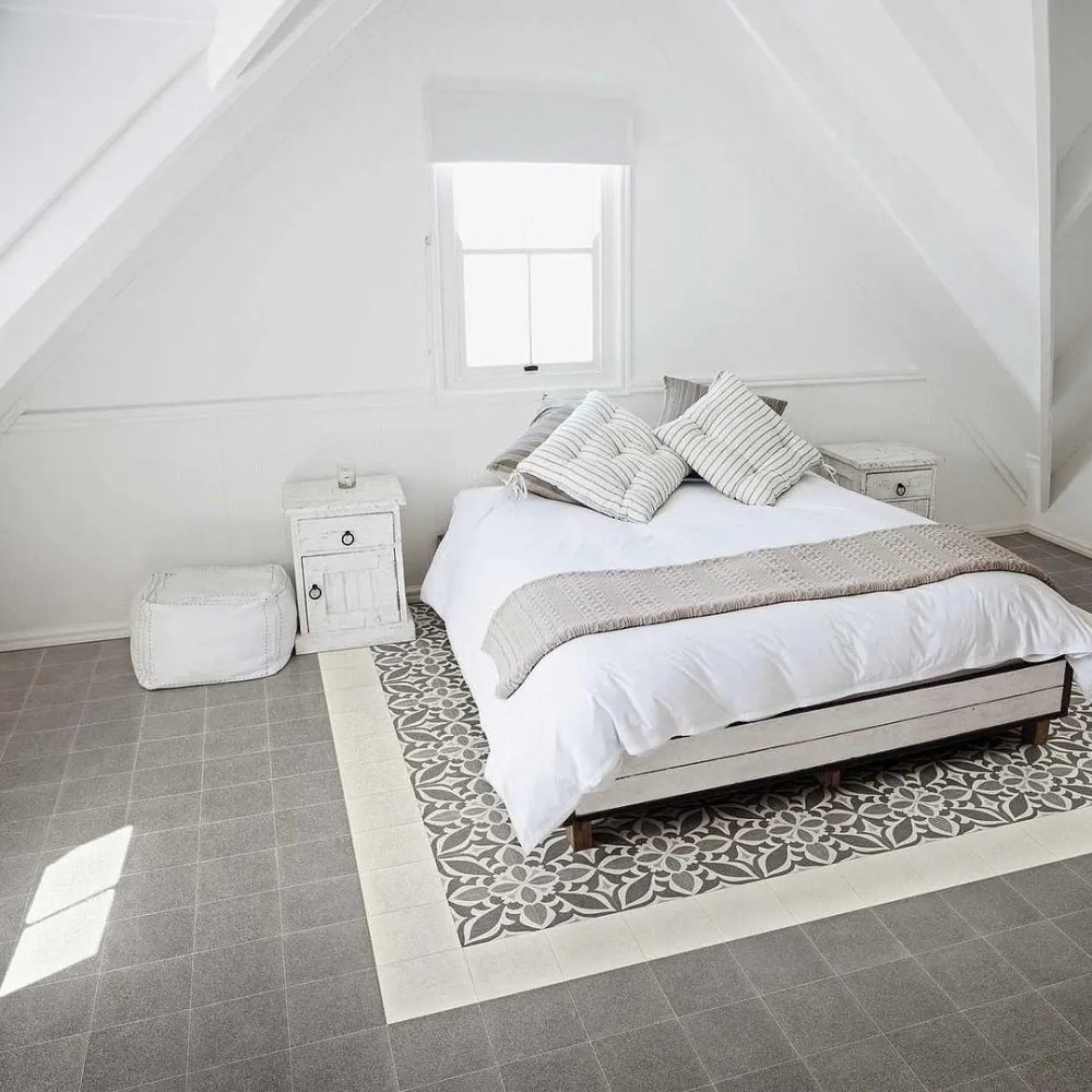 It offers a wide range of colours (white, grey, mud, orange, light blue, anthracite) and decorative elements such as Decoro Mix and modular carpets.