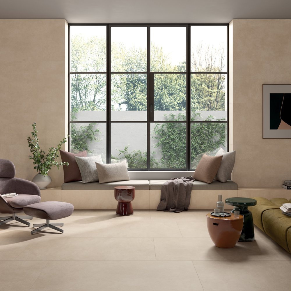 tile floor flooring paving wall tile wall covering porcelain stoneware concrete cement effect tile indoor bathroom kitchen dining room living room bedroom private residential commercial natural matt matte rectified floor heating R10 9mm 0,90cm BOS7 collection 2025 2026