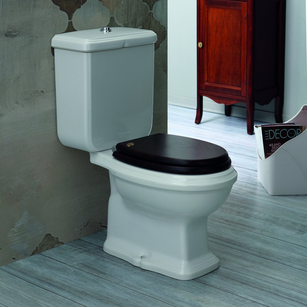 indoro toilette clásico monobloque desagüe pared a ras de tradición cisterna asiento tapa relentizado soft close softclose color nogal madera bisagras cromo retro retrò LO921 LO922 LO008 D21