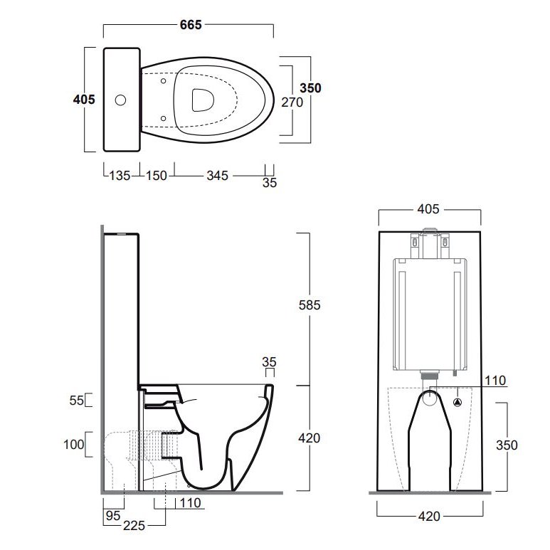 El set incluye: LFT20 - Inodoro con desagüe de pared o de suelo mediante curva técnica CT09/D20 - cisterna monobloque con mecanismo LFT006 - asiento de inodoro termoestable blanco con bisagras relentizadas cromadas de desenganche rápido