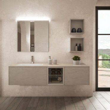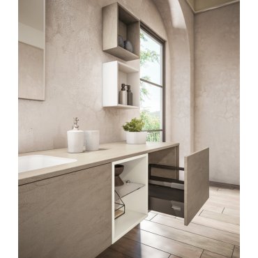 Premi e Apri, una colección de mobiliario de baño funcional y con estilo de Mobilduenne, ofrece un sistema práctico y limpio mediante el uso de un sistema de “empuja y abre” que da a esta serie un toque contemporáneo.