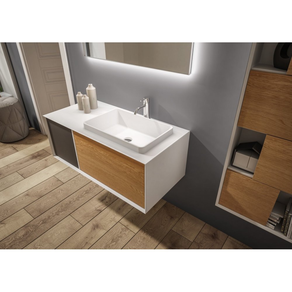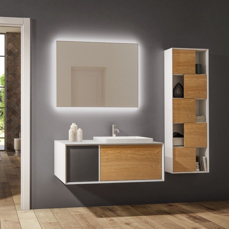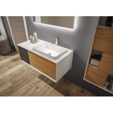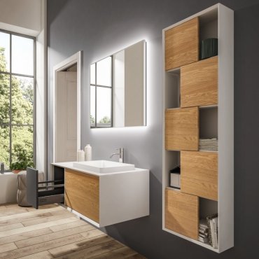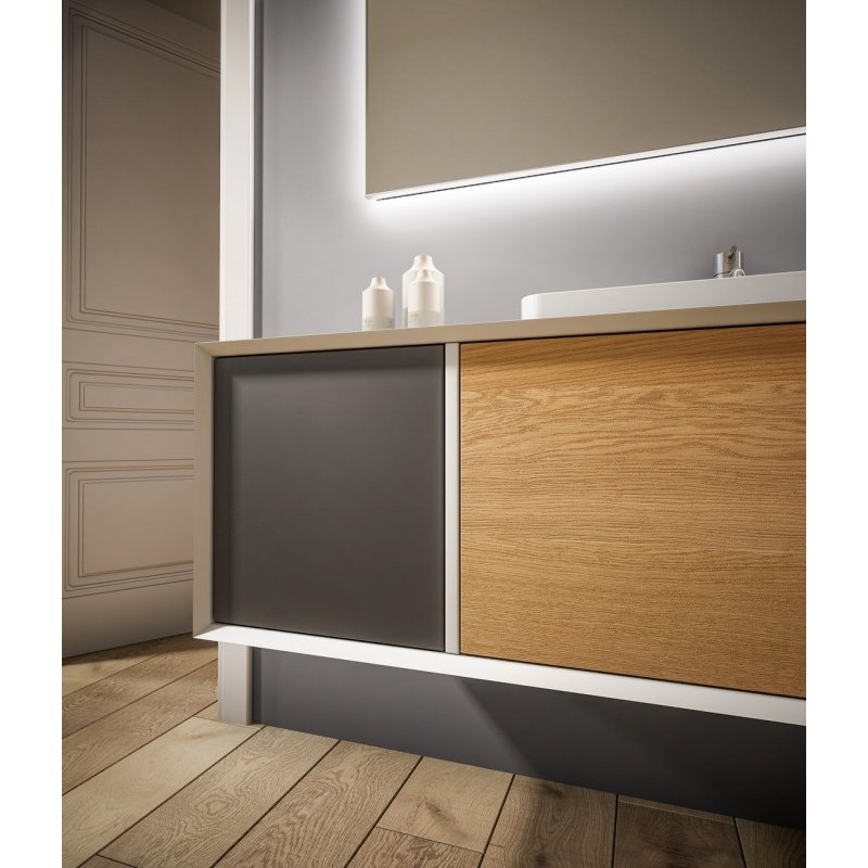 Cornice 45° es una de las colecciones más innovadoras de Mobilduenne ya que ofrece varios modelos a partir de las líneas sencillas y esenciales de New Life a las que añade un marco con ángulos de 45º que da profundidad al mueble de baño.