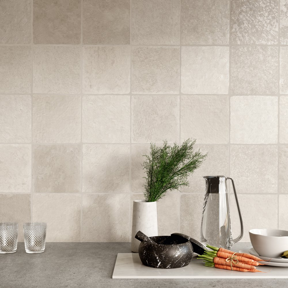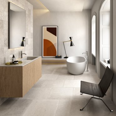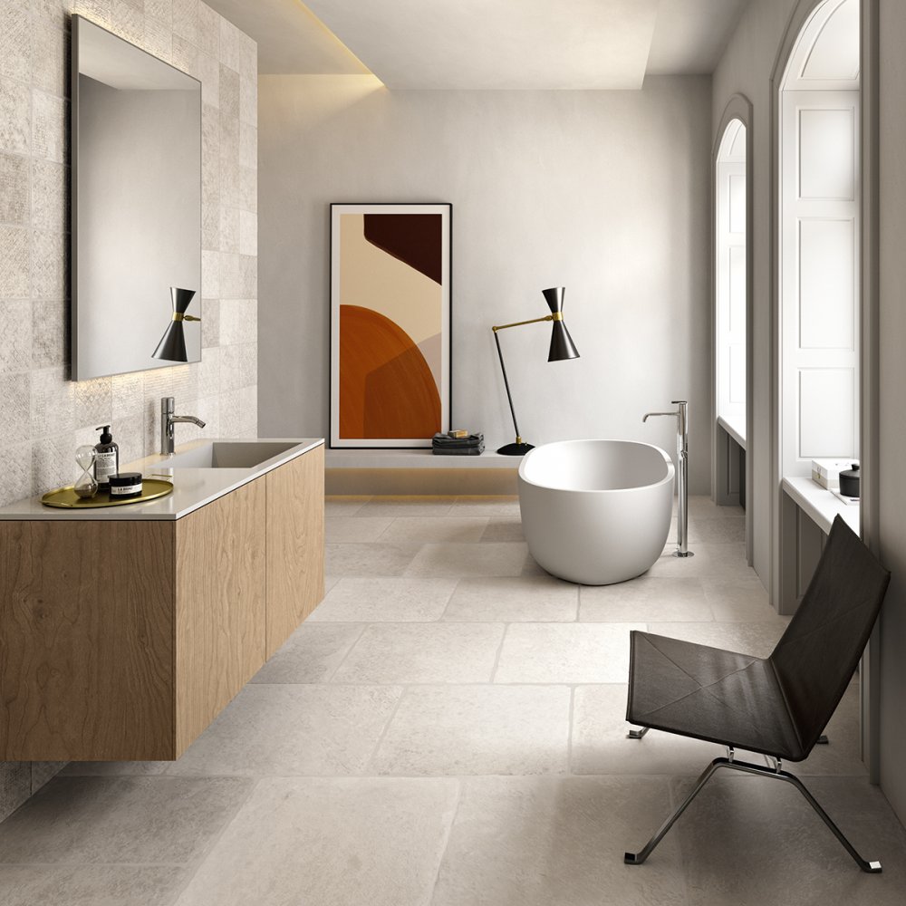 Los cuatro colores Taupe, Gris, Beige y White están disponibles en tamaños con acabado rectificado 60X60 - 80X80 - 60X120 pero también en varios tamaños y mosaicos con acabado “burattato” que, si se combinan con la decoración Traces, garantizan un resultado personalizado y exclusivo.