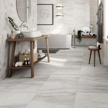 La colección reproduce un mármol cuarcífero originario de Brasil con su característico fondo blanco surcado por delicadas vetas tono sobre tono.