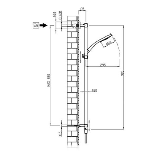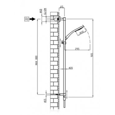 Barra deslizante compuesta por: barra con varilla totalmente de latón con entrada de agua superior integrada, ducha antical 5 chorros diam.110 mm, manguera flexible antitorsión cm.150.