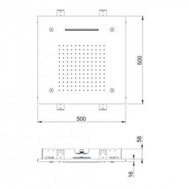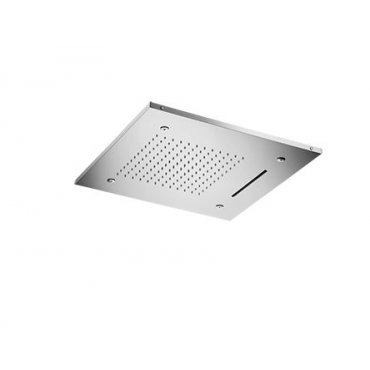 Rociador de ducha mural cuadrada de acero inoxidable, anticalcárea, con 3 chorros: lluvia, cascada y nebulizador con cromoterapia, dimensiones 500x500 mm, con kit de fijación para aplicación en el techo, con alimentación y mando a distancia.