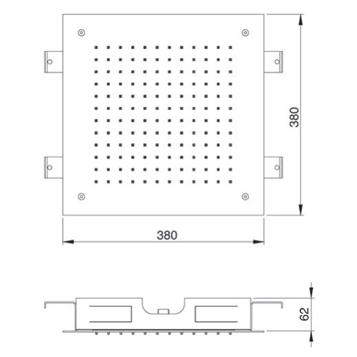 Rociador de ducha cuadrado de acero inoxidable, anticalcárea y de 1 chorro, con boquillas de cromoterapia. Dimensiones 380x380 mm Completo con kit de fijación para aplicación en el techo, con alimentación y mando a distancia