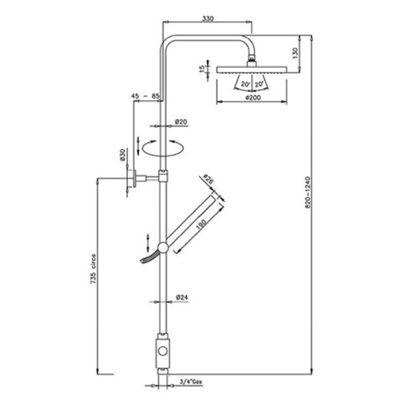 Columna de ducha de latón de sección redonda, con desviador, cabezal de ducha de abs anticalcáreo de Ø 200 mm de ducha manual de abs redonda - sin mezclador.