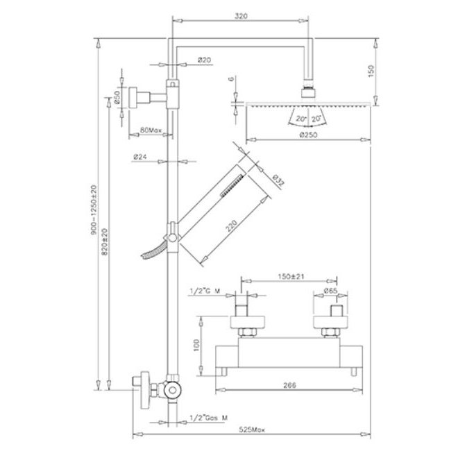 Columna de ducha de latón con cabezal de ducha de acero ultrafino Ø 200 mm. Tubo flexible de doble pinza de 150 cm con teleducha redonda de abs con mezclador termostático "Smart".