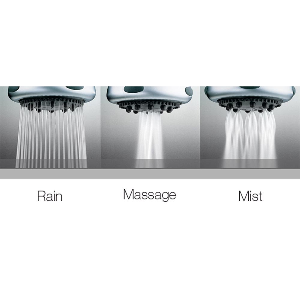 Las diferentes variantes incluyen cascada, ducha de lluvia con brazo de pared horizontal o vertical, duchas laterales y de techo con cromoterapia LED RGB.