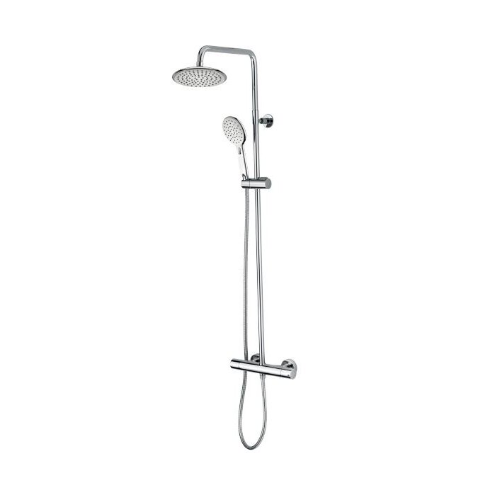 Columna de ducha con sección Ø 20 mm – rociador AGUA Ø 210 mm en ABS – mango ducha AGUA-LIFE – soporte mural orientable – flexible en latón doble grapado 150 cm con conexión ½” H y cono – mezcaldor termostático exterior con desviador integrado.