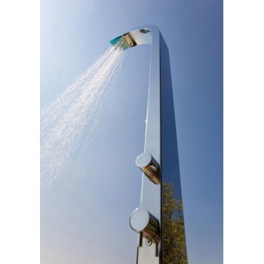 columna de ducha Arch column para exterior de acero inoxidable INOX AISI 316, con alimentación a suelo. Conjunto de ducha con: Kit di fijación a pavimento para la conexión del agua (fría y caliente) - 2 grifos mezcladores - Difusor con chorro lluvia y sistema autolimpiante - Difusor ducha-pie con chorro aireado.