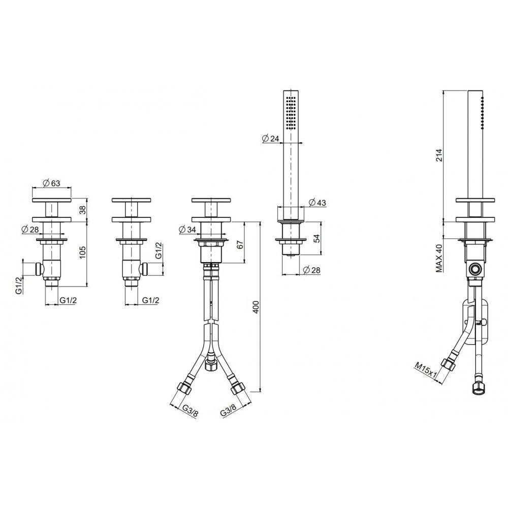 QUADRO DESIGN VALVOLA02 BATERÍA BORDE DE BAÑERA 4 ORIFICIOS CON SET DUCHA
