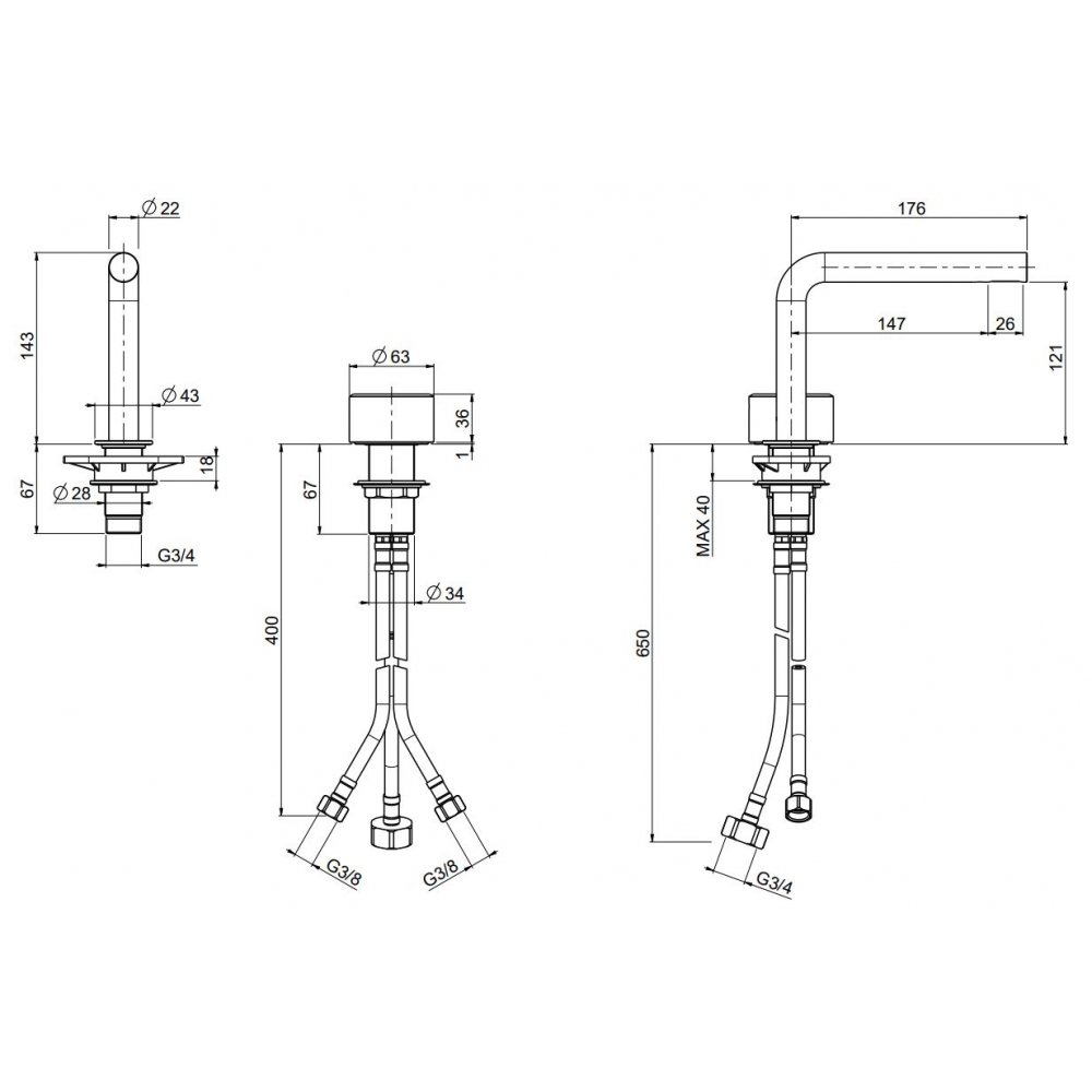 QUADRO DESIGN STEREO MEZCLADOR DE LAVABO DE 2 AGUJEROS H 143 MM
