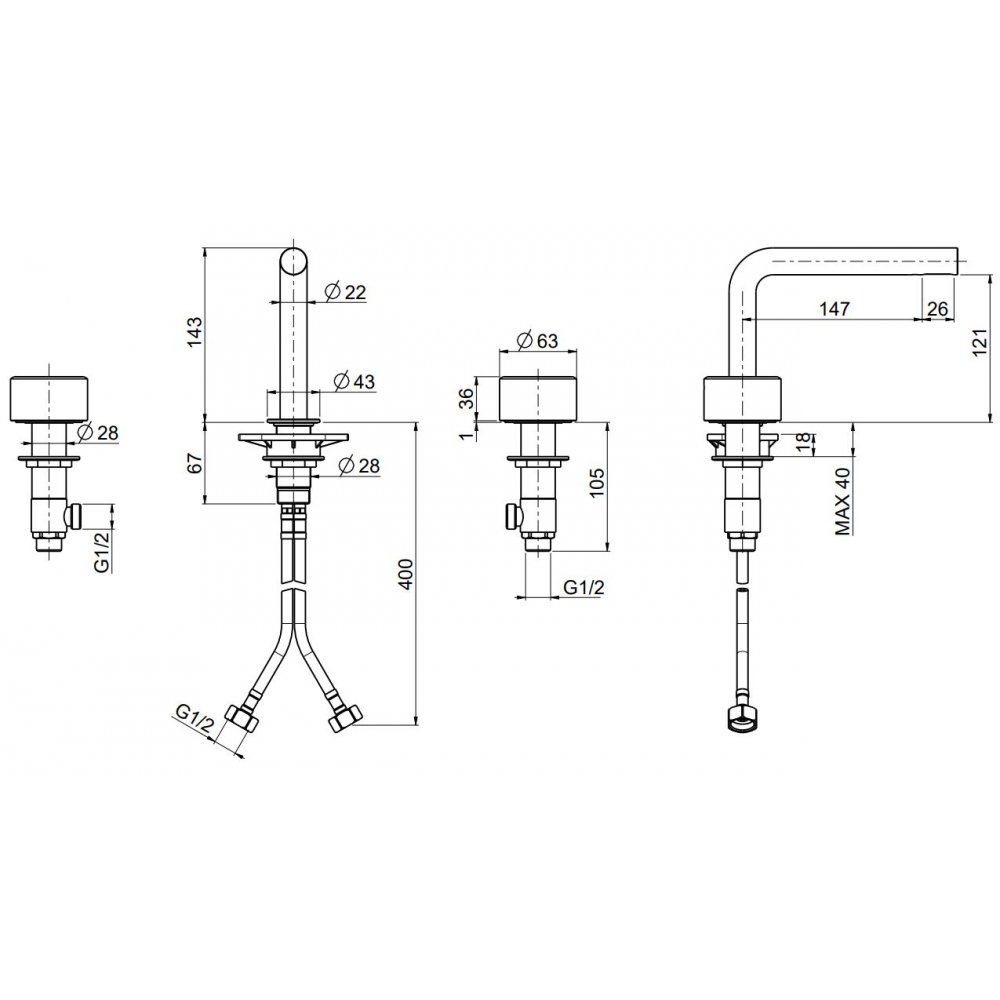 QUADRO DESIGN STEREO MEZCLADOR DE LAVABO DE 3 AGUJEROS H 143 MM