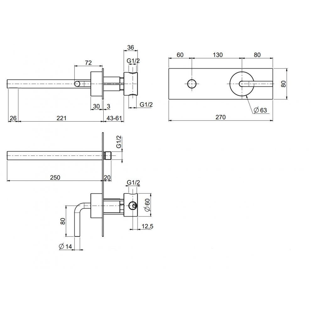 QUADRO DESIGN LEVO MEZCLADOR MURAL DE 2 AGUJEROS CON CAÑÓN DE 250 MM